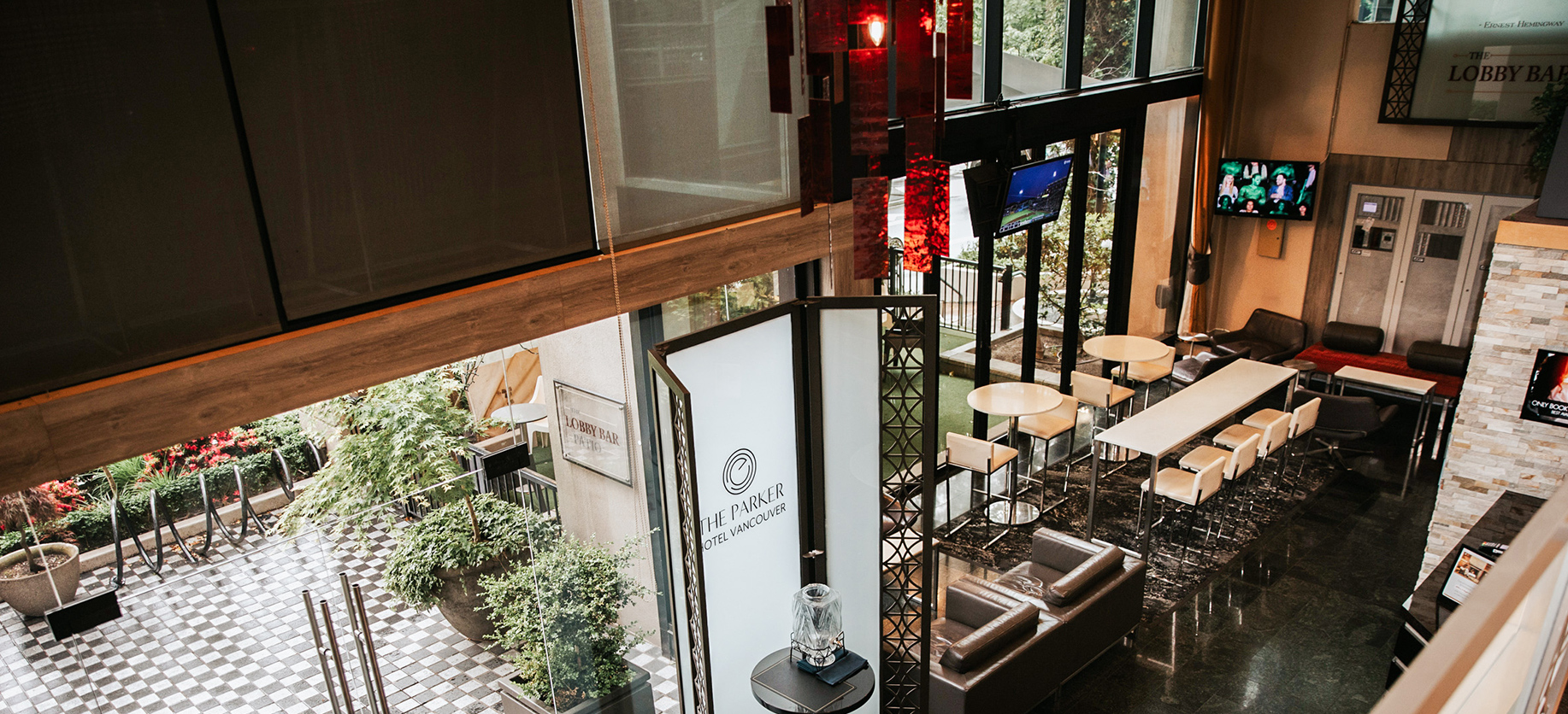 Our private bar has a 10 ft opening glass wall leading to our outdoor hangout spot for Lobby Bar patrons, the outdoor heat lamps on the covered patio keep guests warm in cool weather.